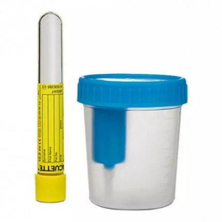 Envase estéril para la recogida de muestras de orina, heces o esputos. Uso tópico. Se recomienda lavar la zona próxima al orificio urinario y emplear la primera orina de la mañana.