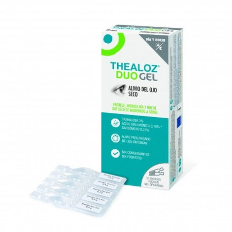 Thealoz Duo Gel Ocular 0,4gr/ml 30 unidades es una combinación especial de trehalosa, ácido hialurónico y carbómero los cuales ofrecen protección, hidratación y lubricación especialmente prolongada para la superficie del ojo. El carbómero permite a permanecer más tiempo en el ojo proporcionando un alivio duradero de los síntomas y signos del ojo seco.