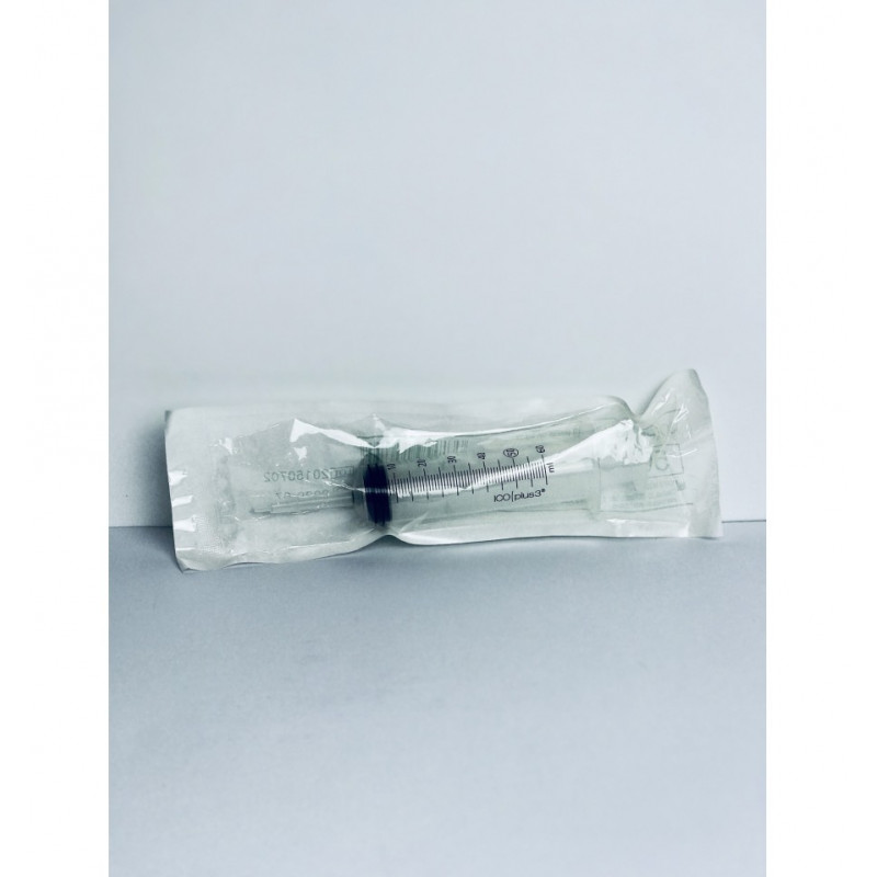 Jeringa sin aguja de 20 ml con boquilla Luer descentrada.