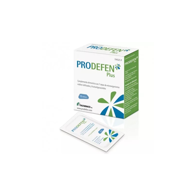 Prodefen Plus 10 Sobres contiene 7 cepas que habitan de forma natural en el intestino, estre ellas Lactobacillus Rhamnosus GG, una de las cepas que más se ha investigado y que cuenta con numerosos ensayos clínicos publicados y literatura científica, estando ampliamente recomendada por las Guías de las Sociedades Científicas. Prodefen Plus incluye la cepa específica de niños Bifidobacterium infantis, que se encuentra de manera habitual en el aparato intestinal infantil. Más información en www.prodefen.com" .
